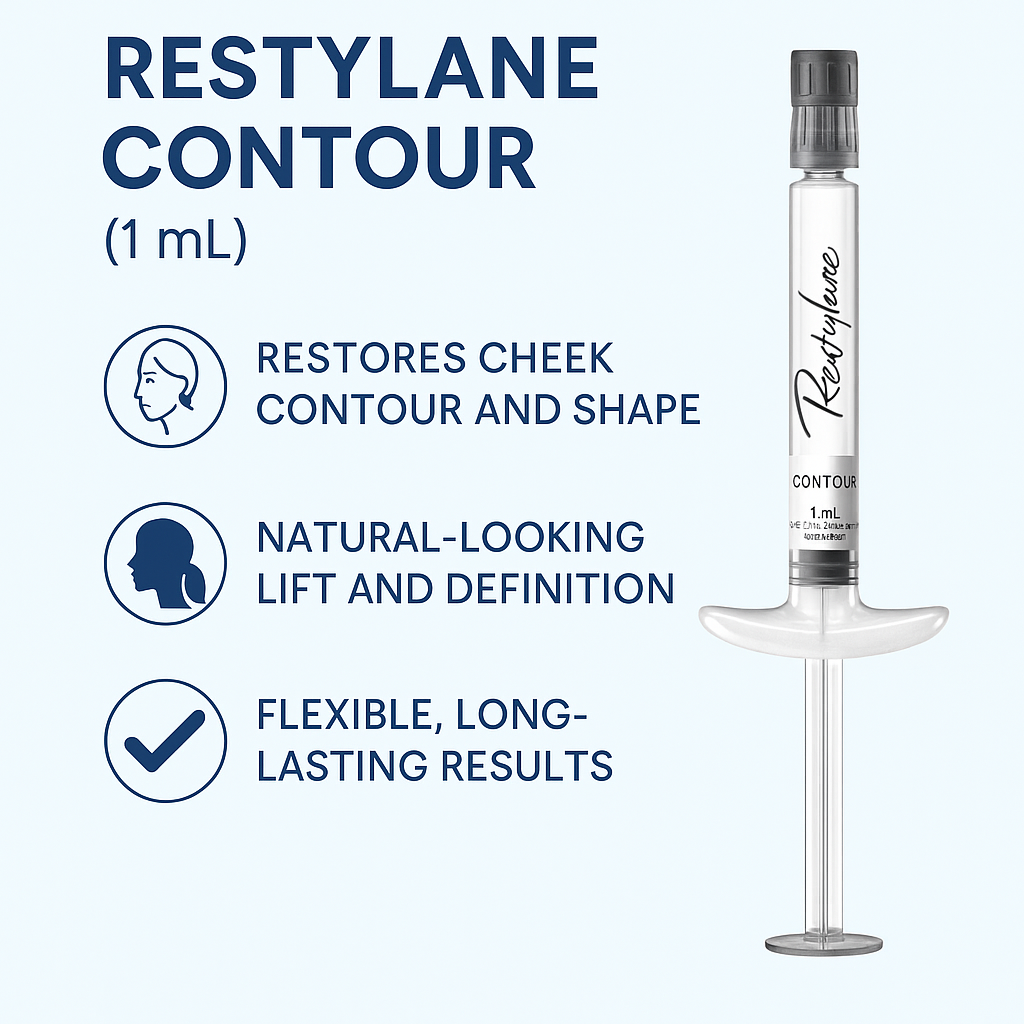 Restore definition and lift to your cheeks with Restylane Contour—a premium filler designed for midface contouring and natural-looking structure. Ideal for patients seeking a more sculpted appearance, this filler integrates smoothly for expressive, flexible results that maintain movement.